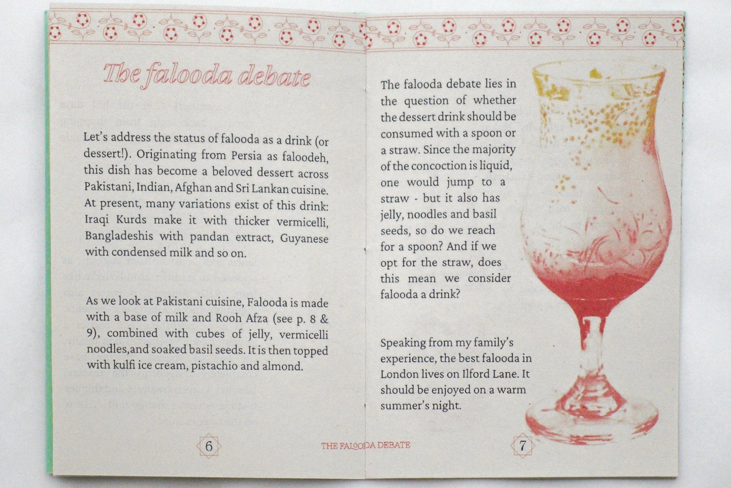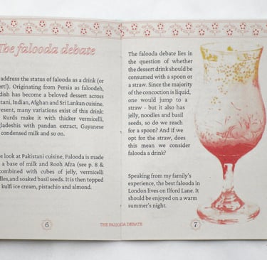 'Nostalgic Drinks of Pakistan' explores cultural memory through the lens of forgotten beverages, transforming personal recollections into collective storytelling. The publication prioritises authentic voices and shared experiences, featuring memories shared by Pakistanis at UAL and beyond. Rather than simply documenting drinks like Rooh Afza and falooda, the project becomes a vessel for diasporic nostalgia, where each beverage serves as an entry point into childhood memories and cultural belonging. The accessible writing style welcomes non-Pakistani readers into unfamiliar cultural territory.